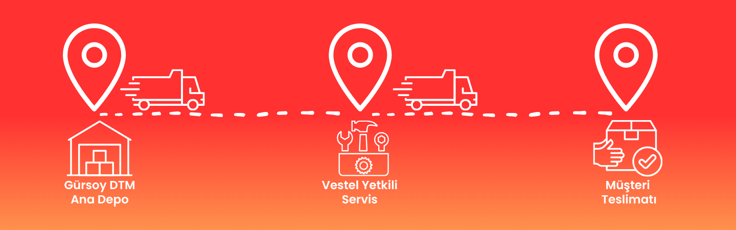Siparişiniz oluşturulduktan sonra ürünleriniz, ana depomuzdan özenle hazırlanarak anlaşmalı lojistik firması aracılığıyla sevk edilir ve en hızlı şekilde adresinize en yakın Vestel Yetkili Servisi’ne ulaştırılır.